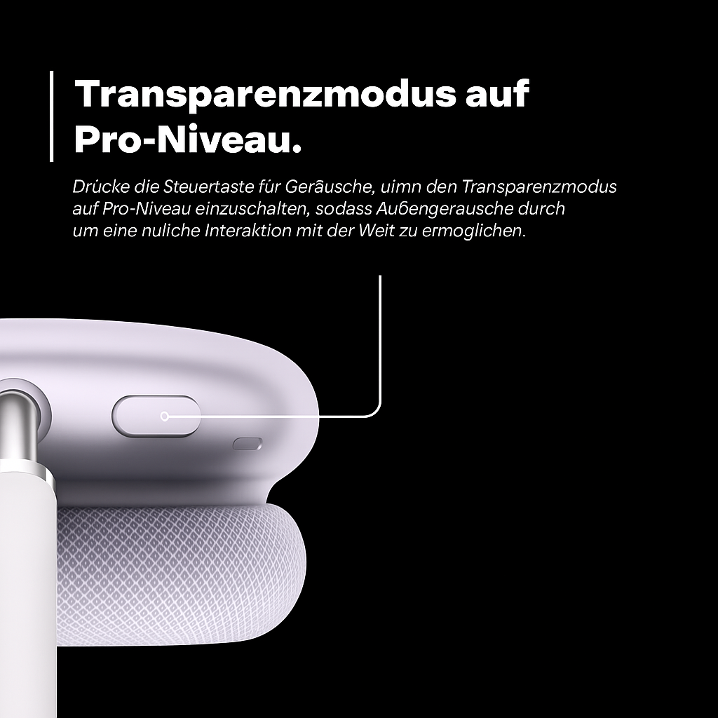Der intelligente Transparenzmodus gibt Ihnen volle Kontrolle, indem er die wichtigsten Geräusche Ihrer Umgebung verstärkt und für perfekte Klarheit sorgt, damit Sie Ihre Musik genießen können, ohne sich jemals von der Welt abzuschotten.
